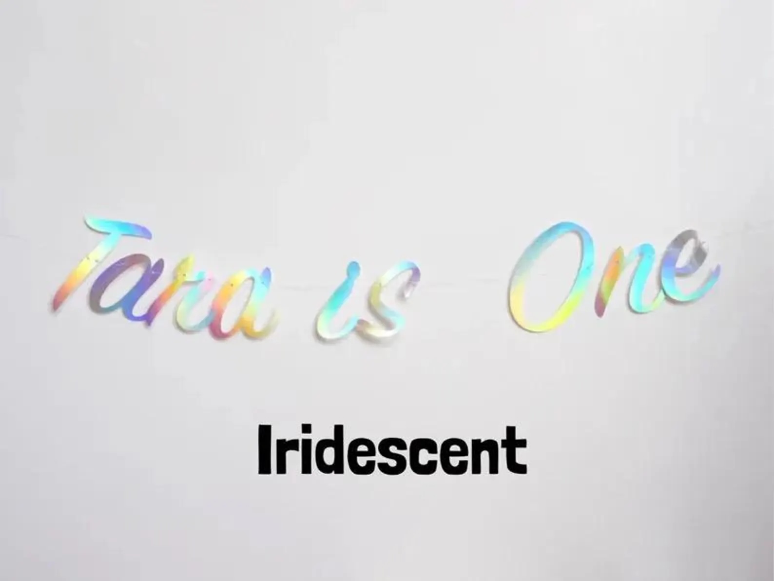 The banner is made of metallic iridescent card and is one-sided. Each letter has been cut out in a lovely handwritten style and will have 2 small puncture holes to thread onto the string.