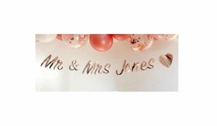 Simply let us know your personalised name during checkout and the letters will be added to the banner. For example, choose Jones and your banner will read ‘Mr & Mrs Jones’