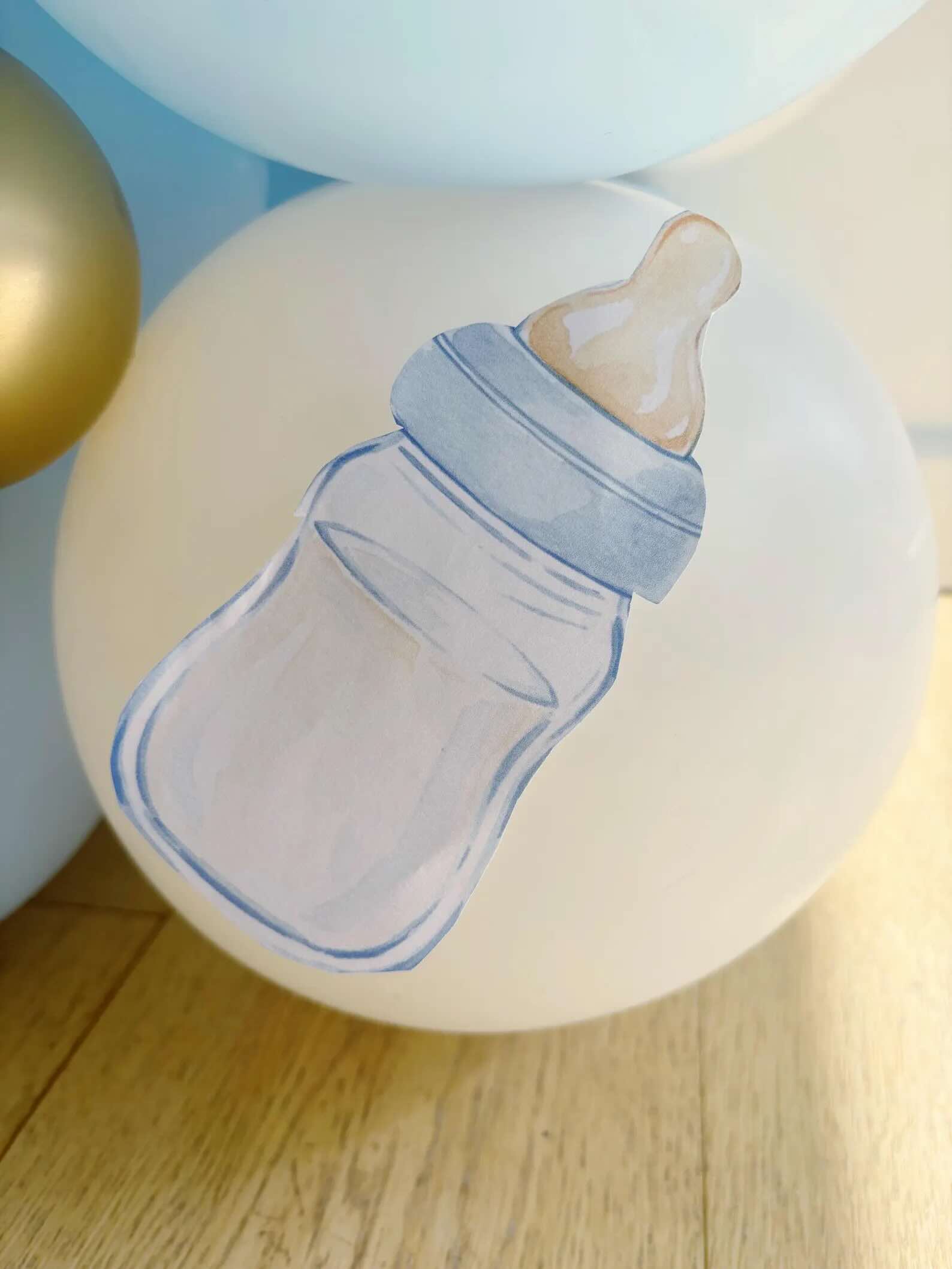 -6 x 5″ balloons in chrome gold, cream and pastel blue