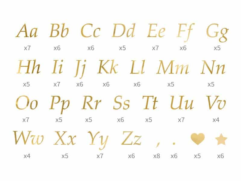 Each set includes 5 sheets with gold metallic stickers: 143 letters and (7 letters A, E, I, O, U, Y, 6 letters B, C, F, J, K, L, S, Z, 5 letters D, G, H, M, N, P, R, T, X i 4 letters W, V) and 28 signs (5 hearts, 8 commas, 6 dots, 6 stars).