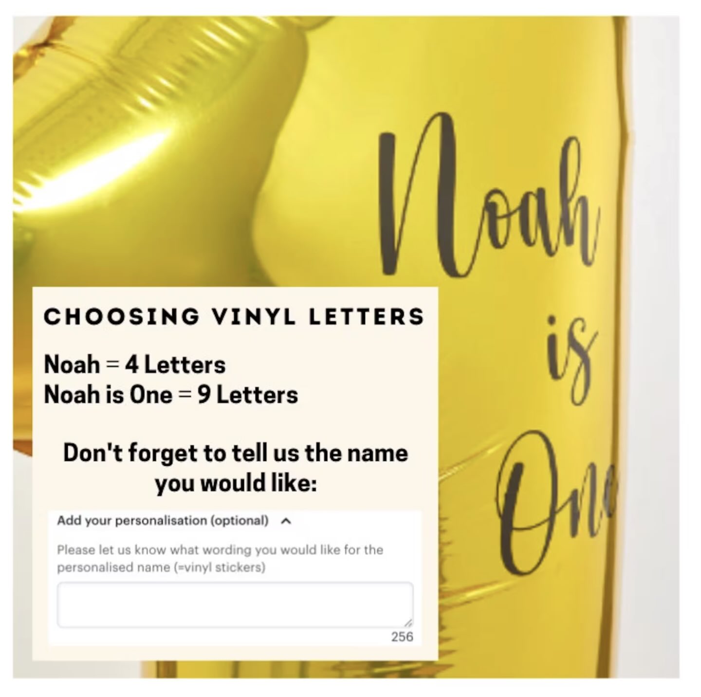 – Blue Vinyl Letter stickers with the wording of your choice. Please select the number of letters you require (eg for Emily is One you will need to choose 10 letters). The letters will be supplied individually.