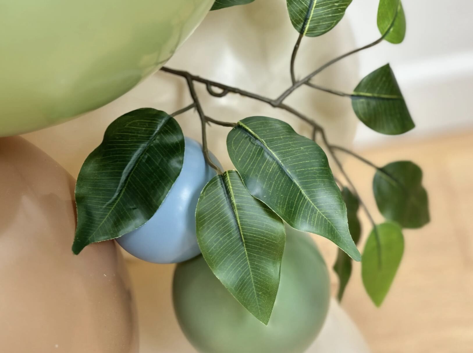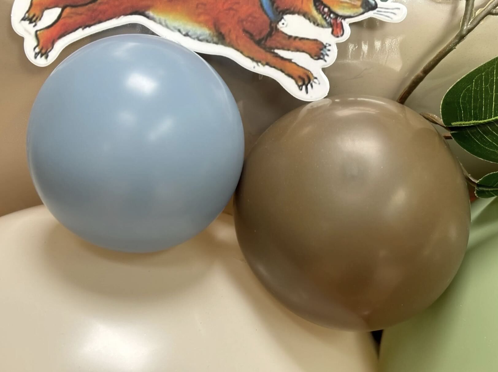 -10 x 5″ balloons in eucalyptus, mocha brown, white sand and blue