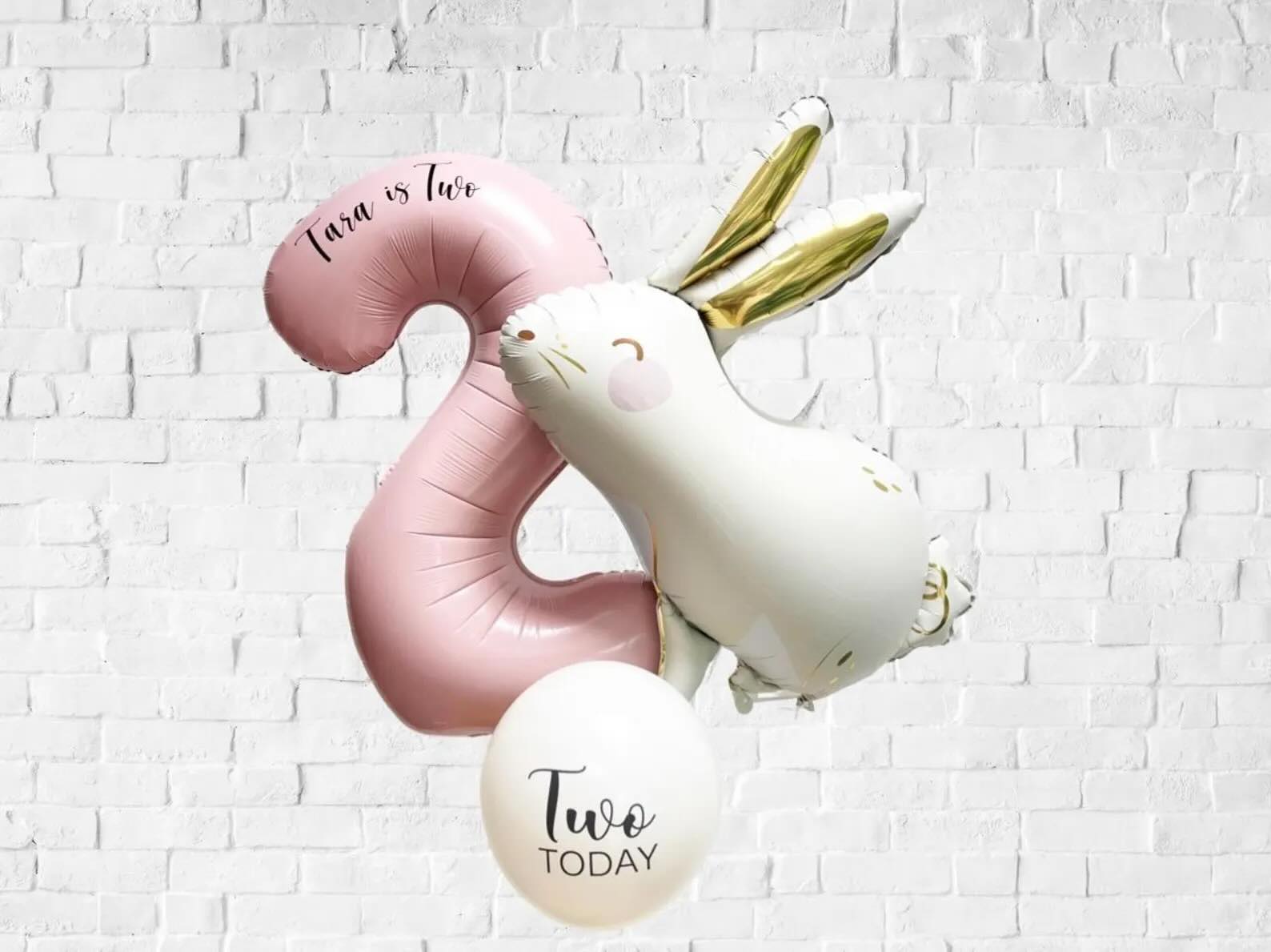 The Personalised Bunny Birthday Balloon Set includes a large 28″/72cm number 1 foil balloon, a large bunny balloon and 2 latex balloons. Make it even more unique by adding your own personalised wording.