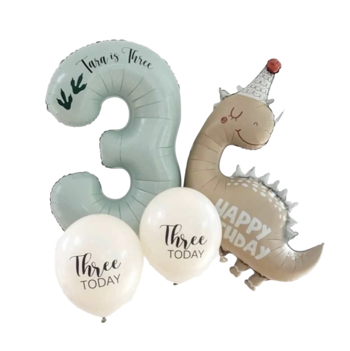 The set includes a large 28″/72cm number 1 foil balloon, a large dino balloon and 2 ‘xxx Today’ latex balloons.