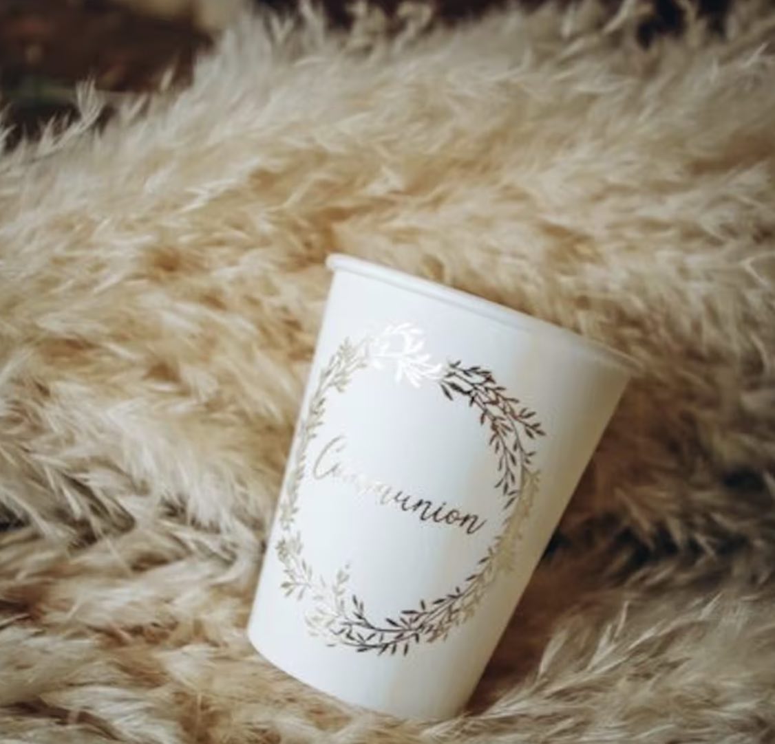 These stunning paper cups are an elegant addition for your celebration. The cups are white with a metallic gold rim giving them this sophisticated look. Everything to please you! These pretty cups will be perfect to enhance your decor on that special communion day!